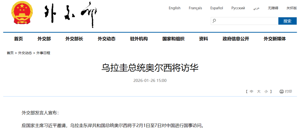 应国家主席习近平邀请,乌拉圭东岸共和国总统奥尔西将于2月1日至7日对中国进行国事访问。