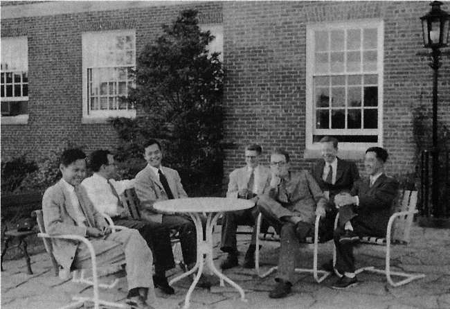 1952年秋杨振宁等物理学家于普林斯顿高等研究院(左起:杨振宁、派斯、李政道、斯诺、爱德华兹、沃德、南部阳一郎)