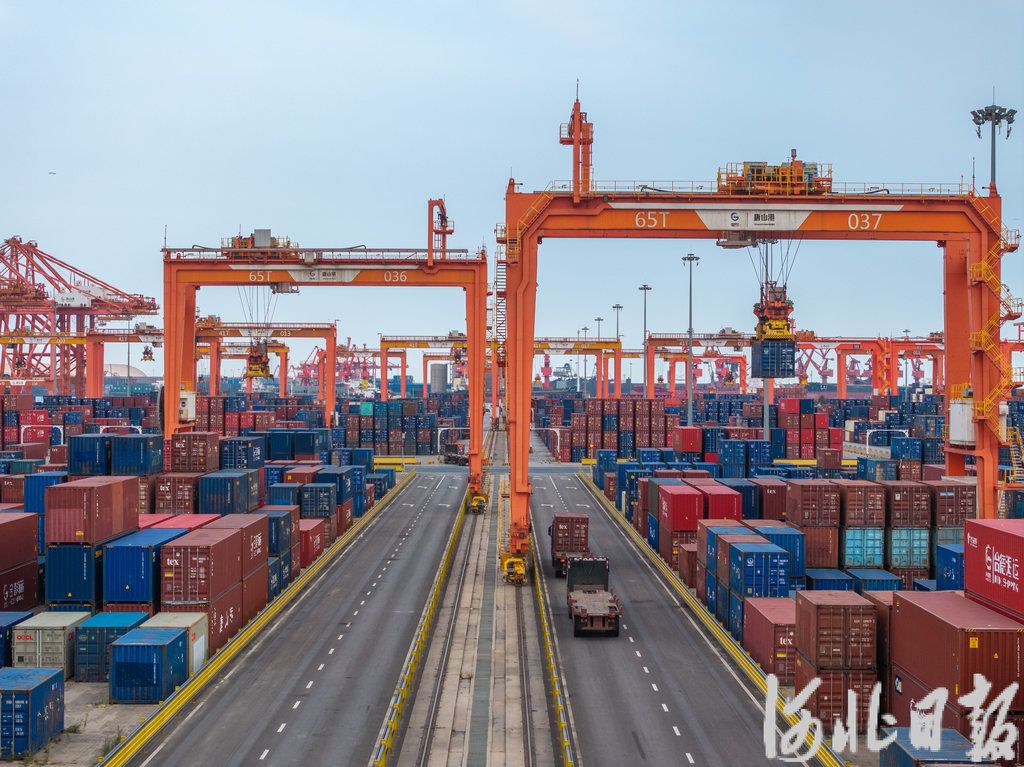 10月23日,在唐山港京唐港区集装箱码头堆场,集装箱运输车在装卸货物。 河北日报记者赵杰摄