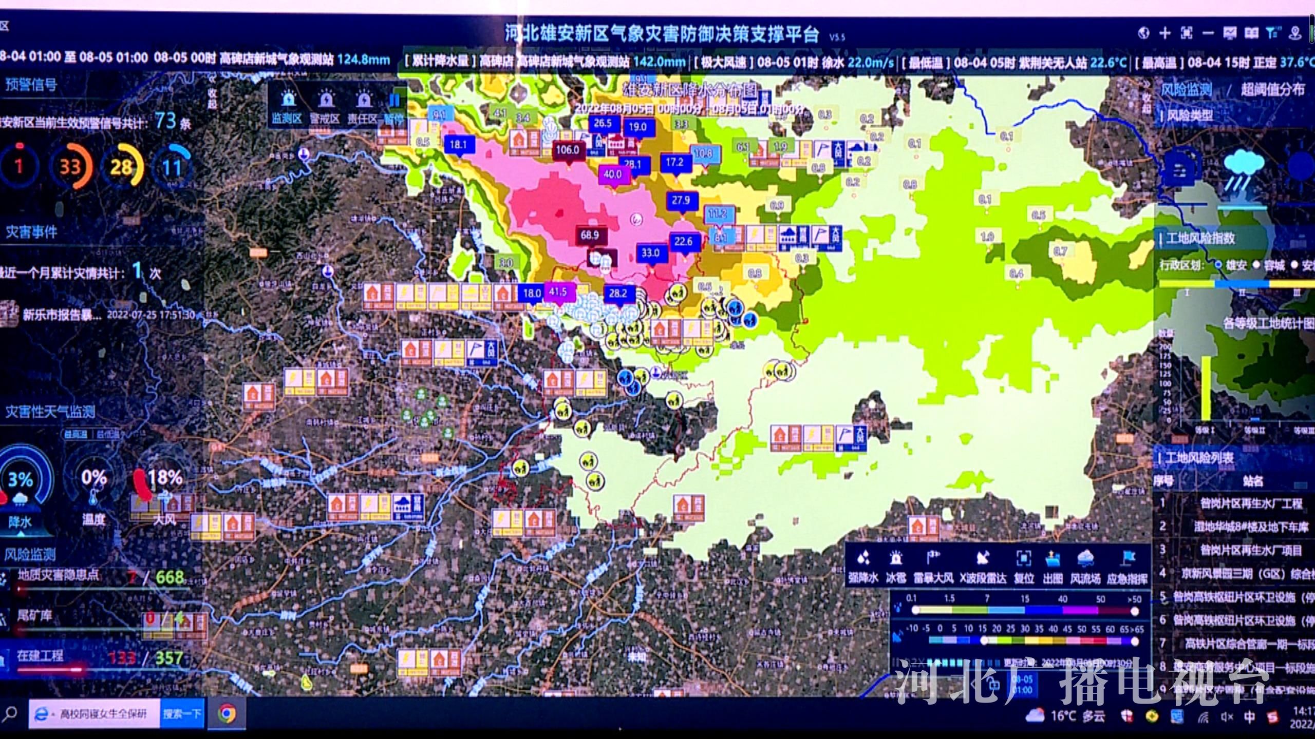 雄安新区工地气象灾害防御预警系统从2021年开始开发建设,在“河北省气象灾害防御决策支撑平台”基础上,结合新区在建工地基础数据、气象站点实况数据和格点预报数据,提供降水实况、雷达回波等服务产品,利用气象灾害影响评估模型和地理信息融合技术手段,分灾种实现了雄安新区全域在建重点工地气象灾害风险实时监测预警功能。