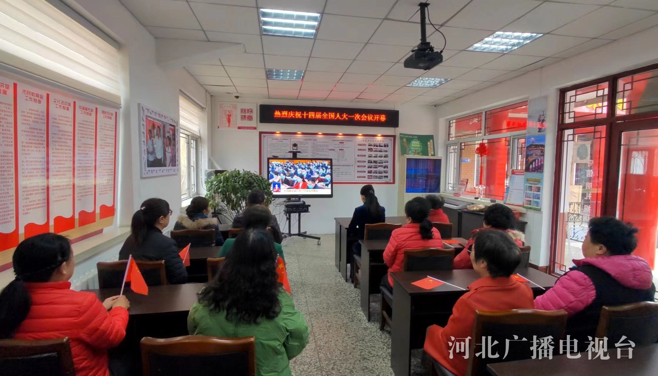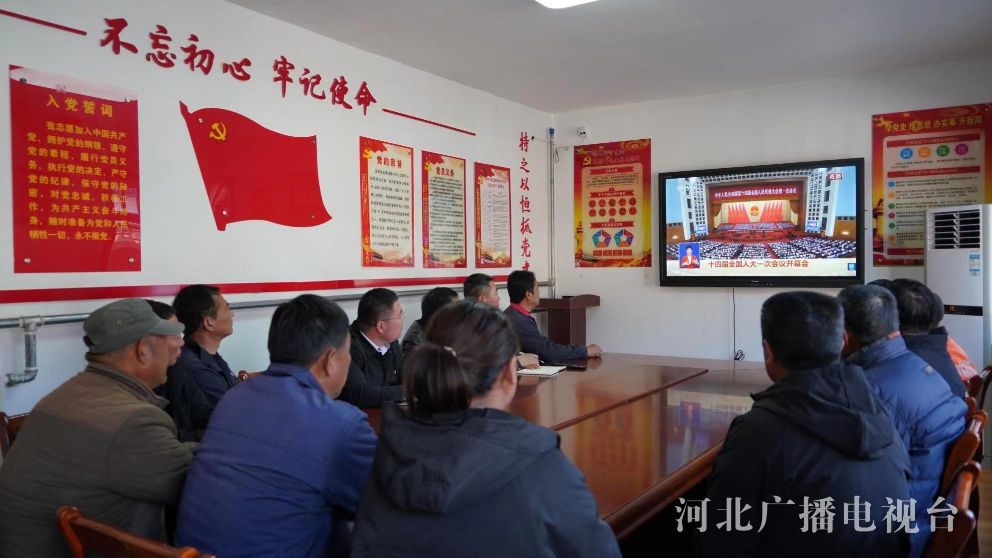 阜平县顾家台村党员干部群众观看十四届全国人大一次会议开幕式。