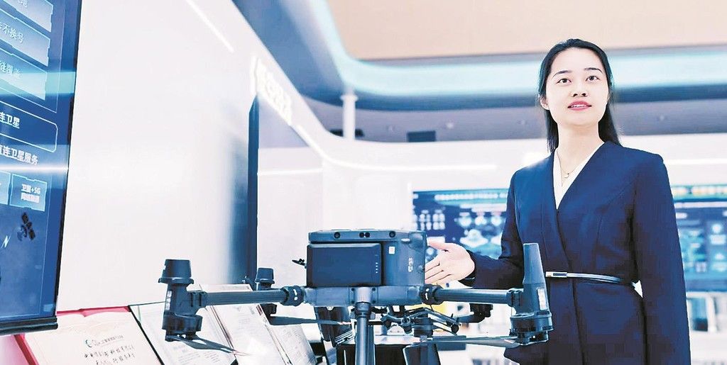 中国电信科技创新馆内,展馆负责人贾梦霜介绍无人机远程操控执行园区巡检、物流运输任务等场景。(资料片)