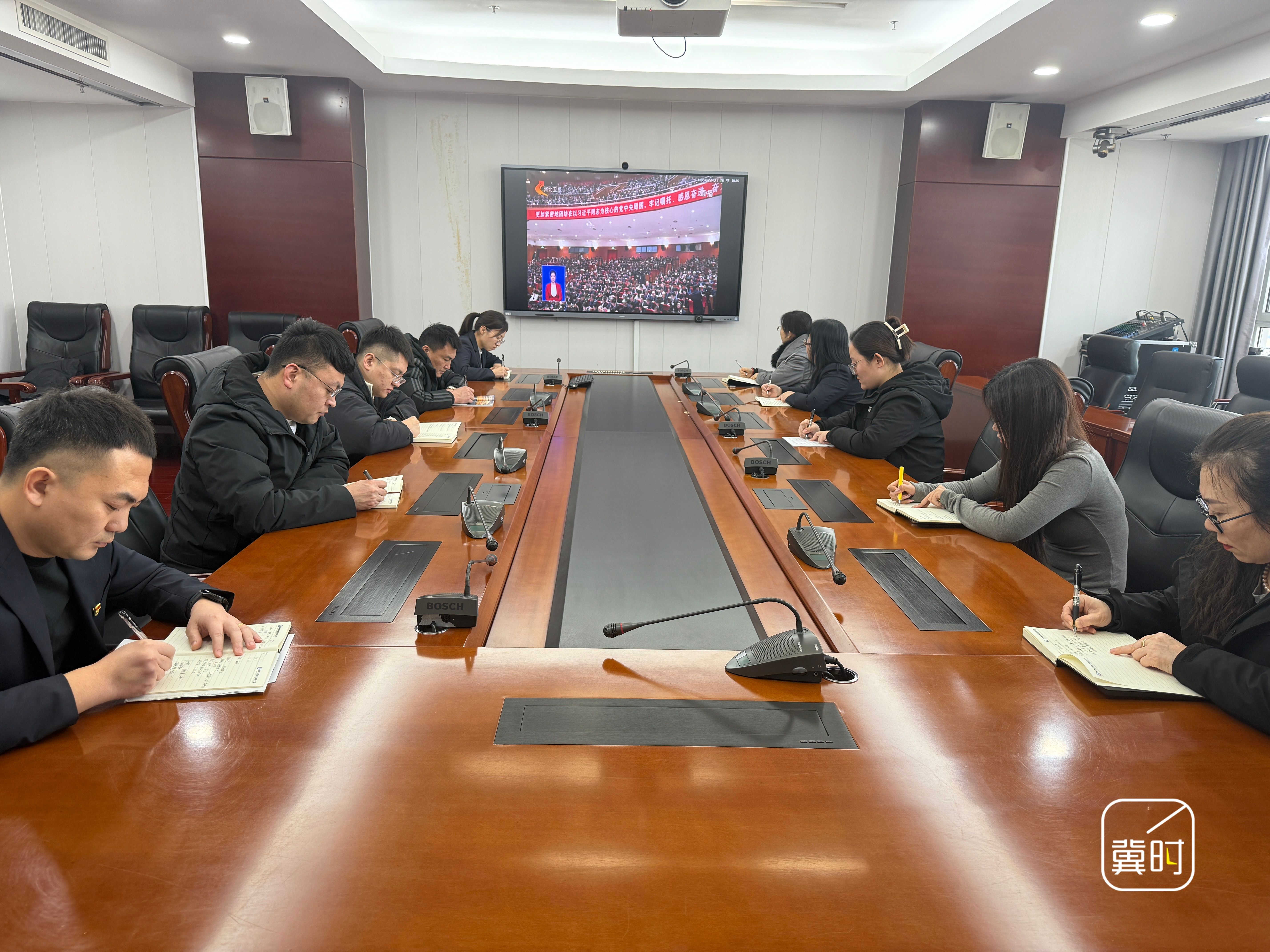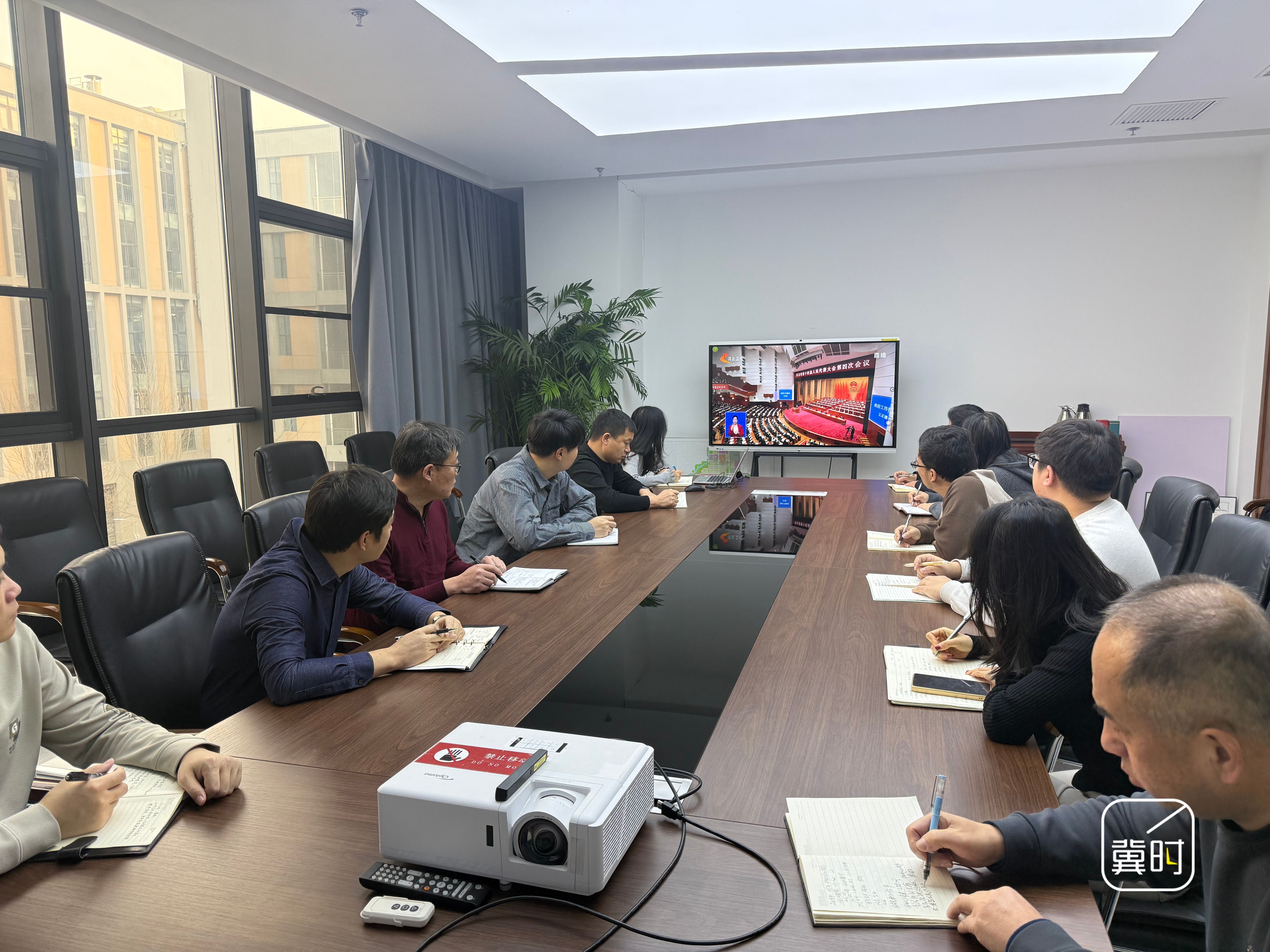 石家庄国际生物医药园管委会的干部职工集中收听收看省十四届人大四次会议开幕会直播,认真聆听《政府工作报告》。(河北台 王丹 陈卓)