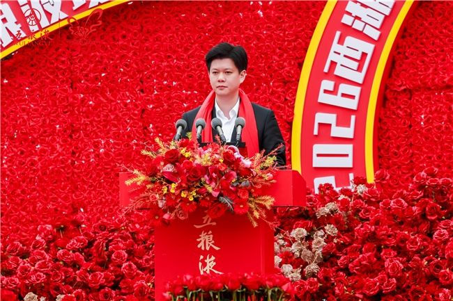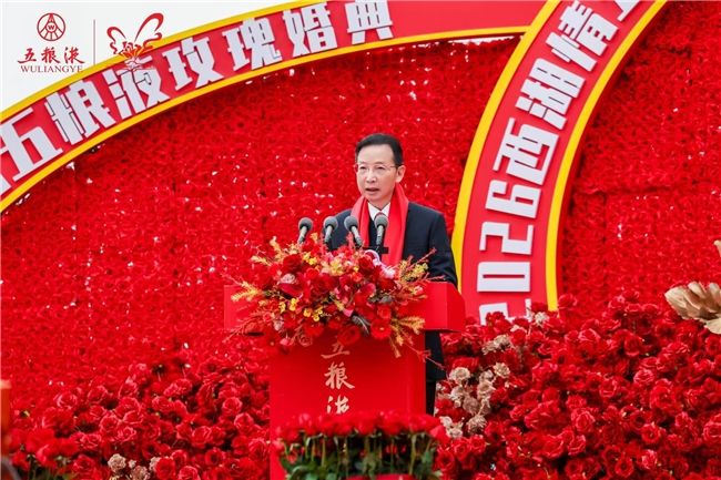 发布会上,中共杭州市委宣传部副部长、市文明办主任王文硕致辞,宜宾五粮液股份有限公司副总经理王源培致贺词,主办单位领导以西湖之水寄和美之情,共同开启第28届(2026)中国国际西湖情五粮液玫瑰婚典序幕!