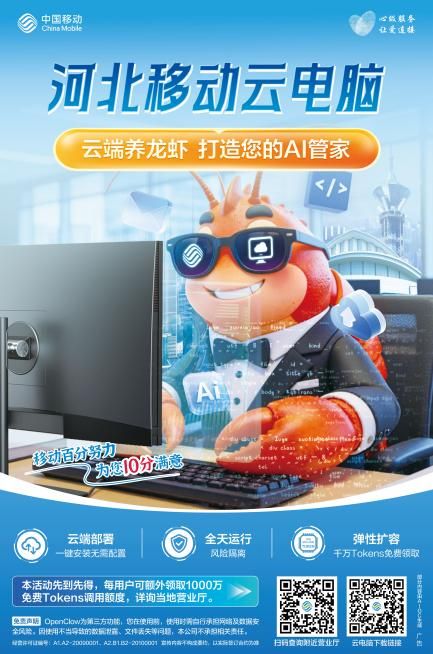 还在羡慕不少用户都在养的AI“龙虾”,却被配置不够、部署复杂、环境折腾拦在门外?河北移动云电脑来了!依托中国移动5G+算力网络,为河北用户打造高性能、易上手、超安全的云端工作站,OpenClaw龙虾智能体免费装、免费教、免费领Tokens,零基础也能养出专属数字员工,办公提效、生活省心一步清晰落地!