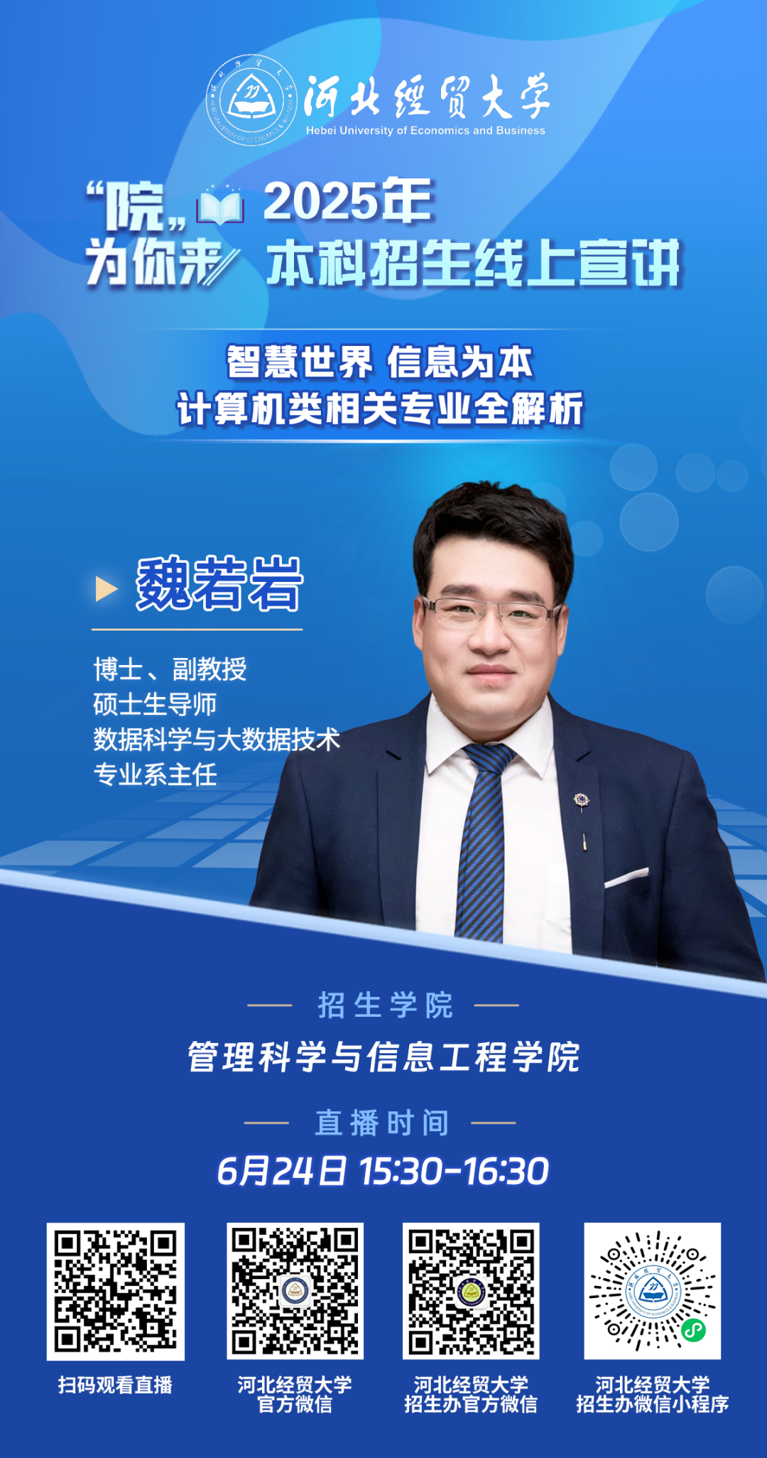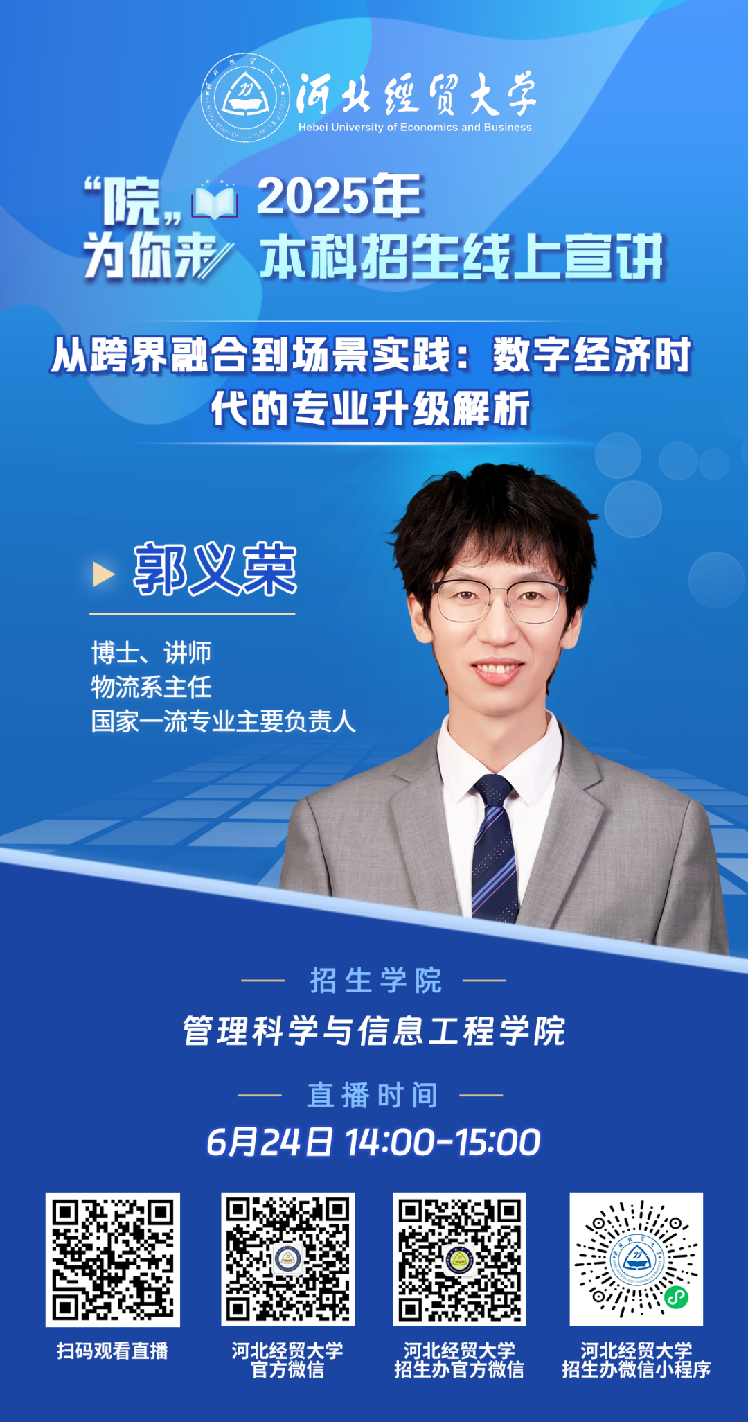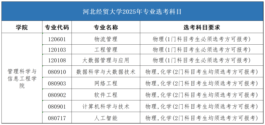 管理科学与信息工程学院以实现信息技术、管理科学与工程的学科交叉融合为特色,培养复合性应用型高素质新财经人才。开设有计算机科学与技术、软件工程、网络工程、数据科学与大数据技术、人工智能、大数据管理与应用、物流管理、工程管理8个本科专业,其中1个国家级一流专业建设点、1个国家级特色专业、4个河北省一流专业建设点。具有推荐优秀应届本科毕业生免试攻读硕士学位研究生资格。研究生培养层次具有管理科学与工程、计算机科学与技术2个一级学科硕士学位授权点,计算机技术、工程管理2个专业硕士学位授权点。