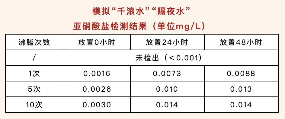 实验发现,随着加热沸腾次数的增加,水中亚硝酸盐含量有略微增加的趋势,放置48小时后亚硝酸盐含量最高为0.014mg/L,但距离我国国家标准生活饮用水中1mg/L亚硝酸盐参考指标限值还很远,所以从这点上来看,所谓的“千滚水”、“隔夜水”是可以放心喝的。